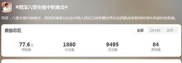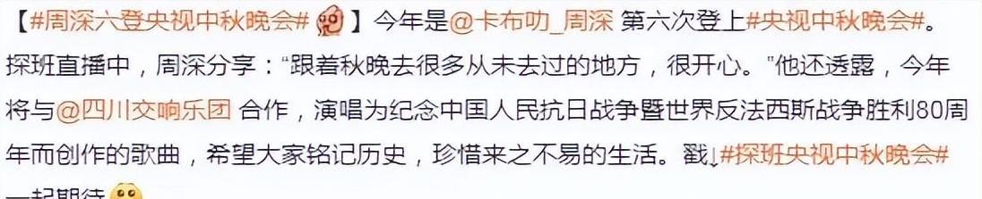 这次中秋晚会的表演还有特别的意义。周深演唱的歌曲是为了纪念中国人民抗日战争暨世界反法西斯战争胜利80周年。选这样的主题,央视中秋晚会想传递的不只是团圆的喜悦,还有对历史的铭记和对和平的珍惜。周深用歌声传递爱国情怀,唱出了中国人的精气神。