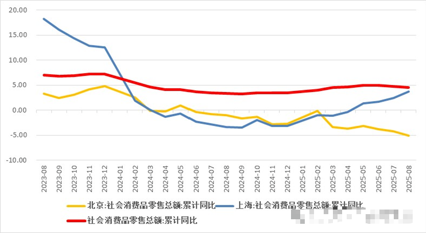 从2025年刚公布的社零增速看,北京下滑2.9%,是全国唯一负增长的地区;天津增速仅0.3%,排倒数第二。再看2024年,上海增速-3.1%,全国垫底;北京-2.7%,倒数第三(天津同样垫底)。
