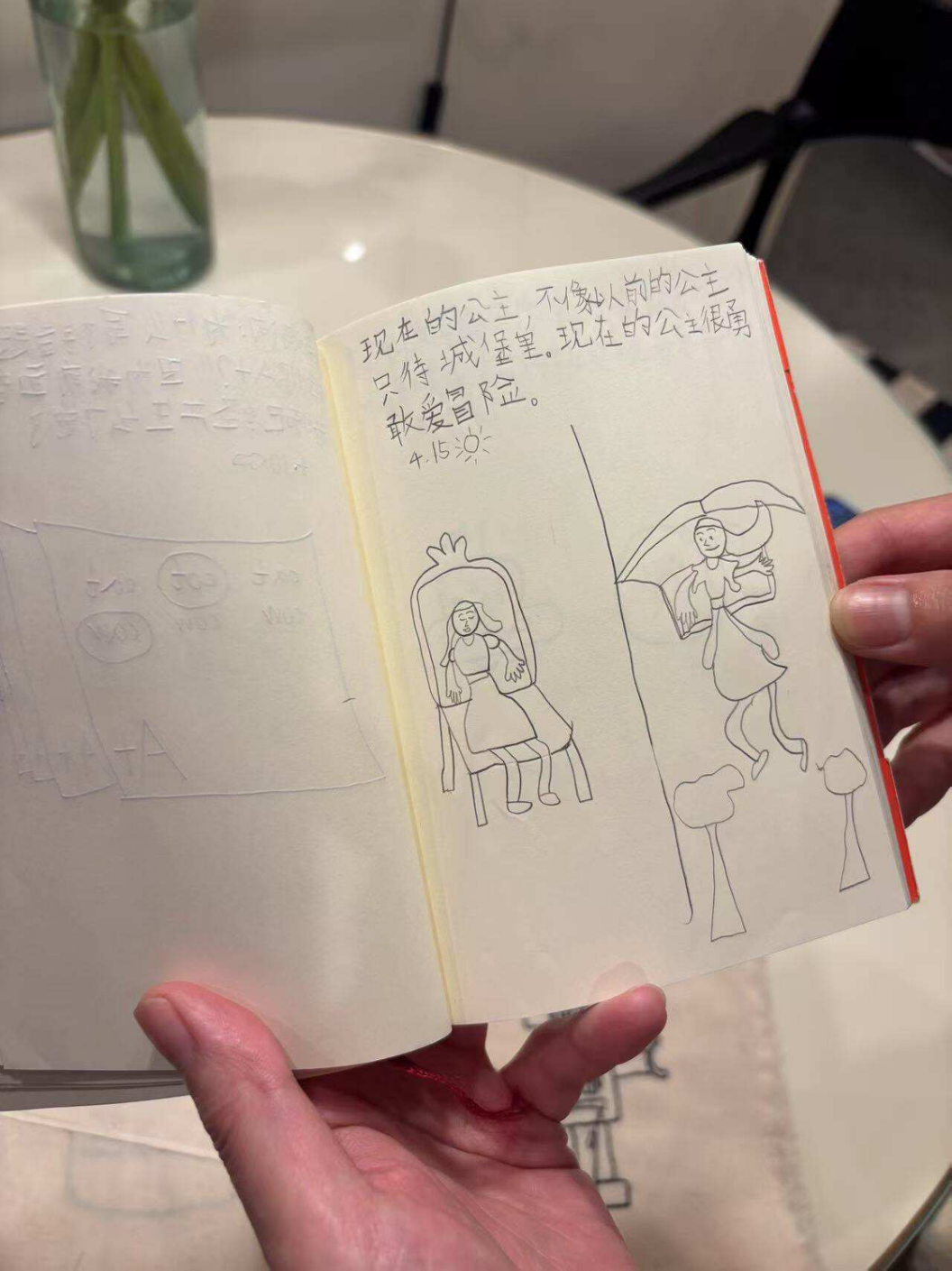 比如,Dora甚少会画“公主”,为数不多的“公主”,是她画了一个坐在凳子上的公主,以及一个跳降落伞的公主。她的日记配文是:“现在的公主,不像以前的公主只待城堡里。现在的公主很勇敢爱冒险。”