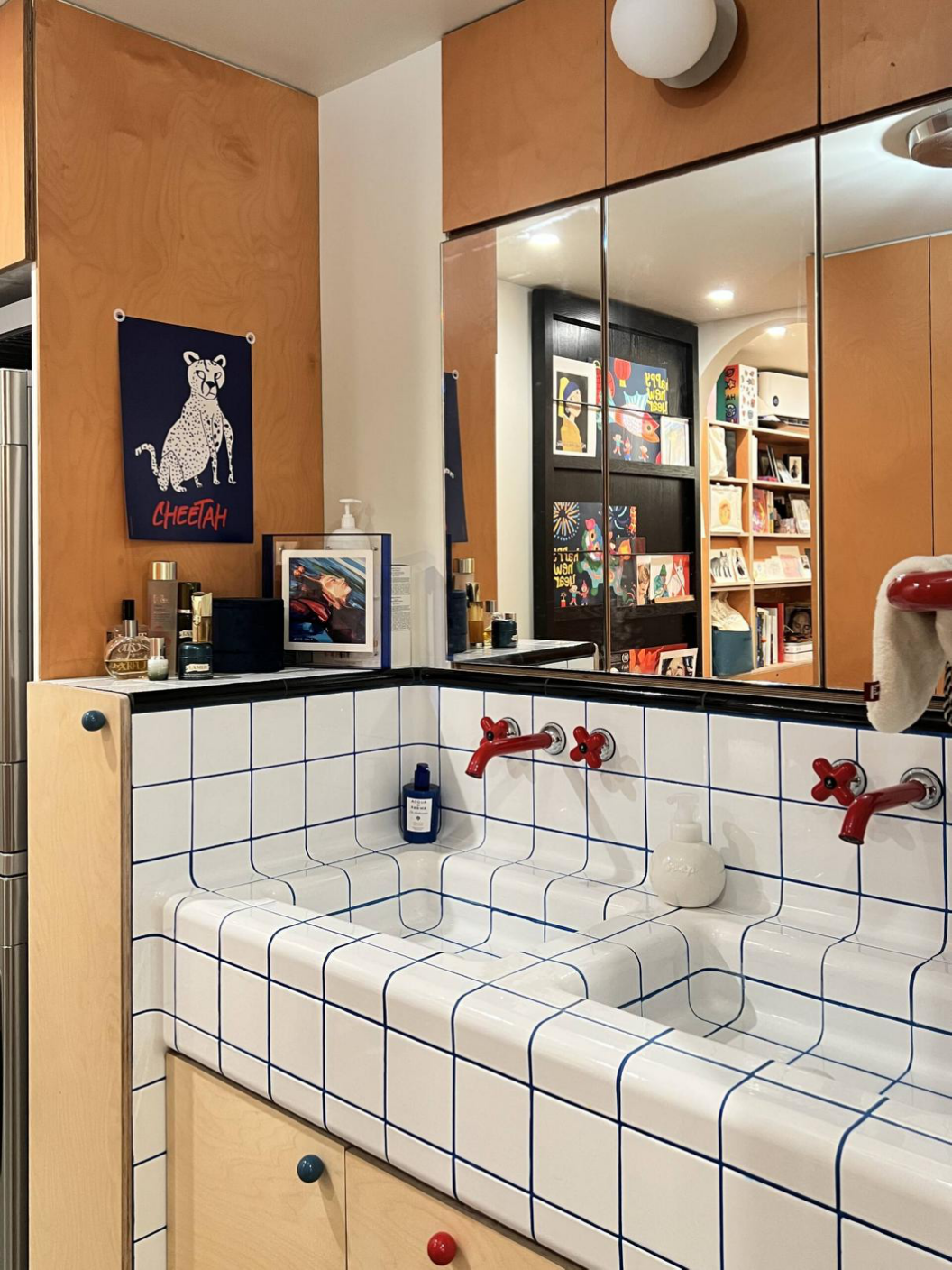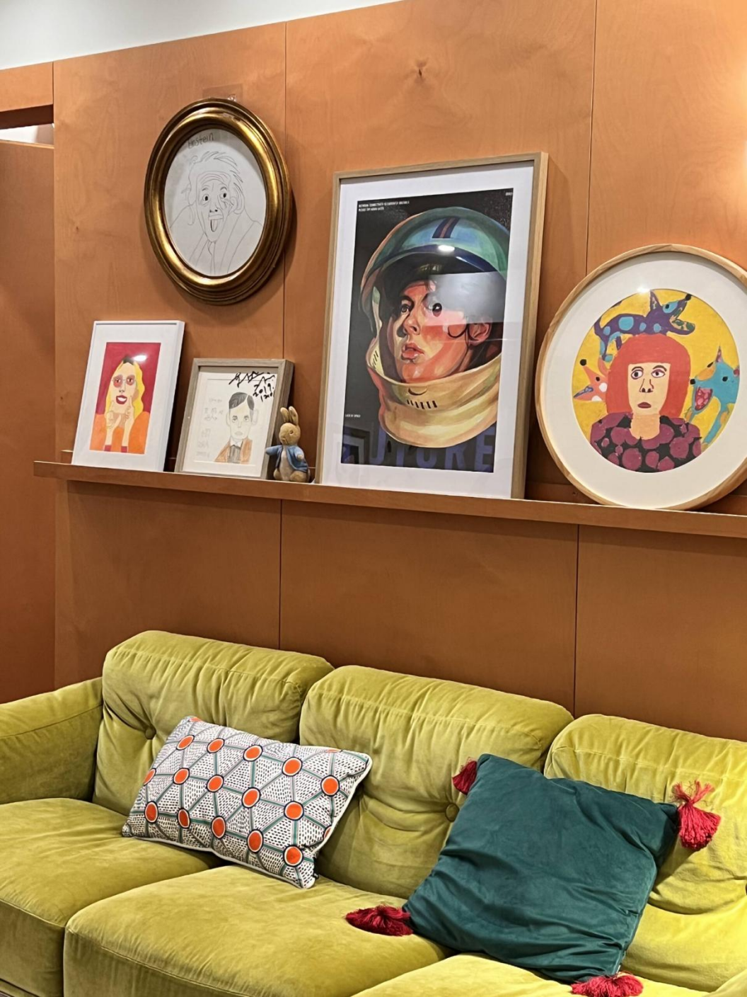 在Room tour时,我们笑称“Doris是女儿最大的站姐”。女儿笔下的《天使爱美丽》《戴珍珠项链的少女》《安迪沃霍尔》《HER》等画作,都被Doris做成了各种周边:徽章、贴纸、帆布包、漱口杯,手写的日记页也被一针一线绣进刺绣本里,还曾在无印良品的展览中展出。
