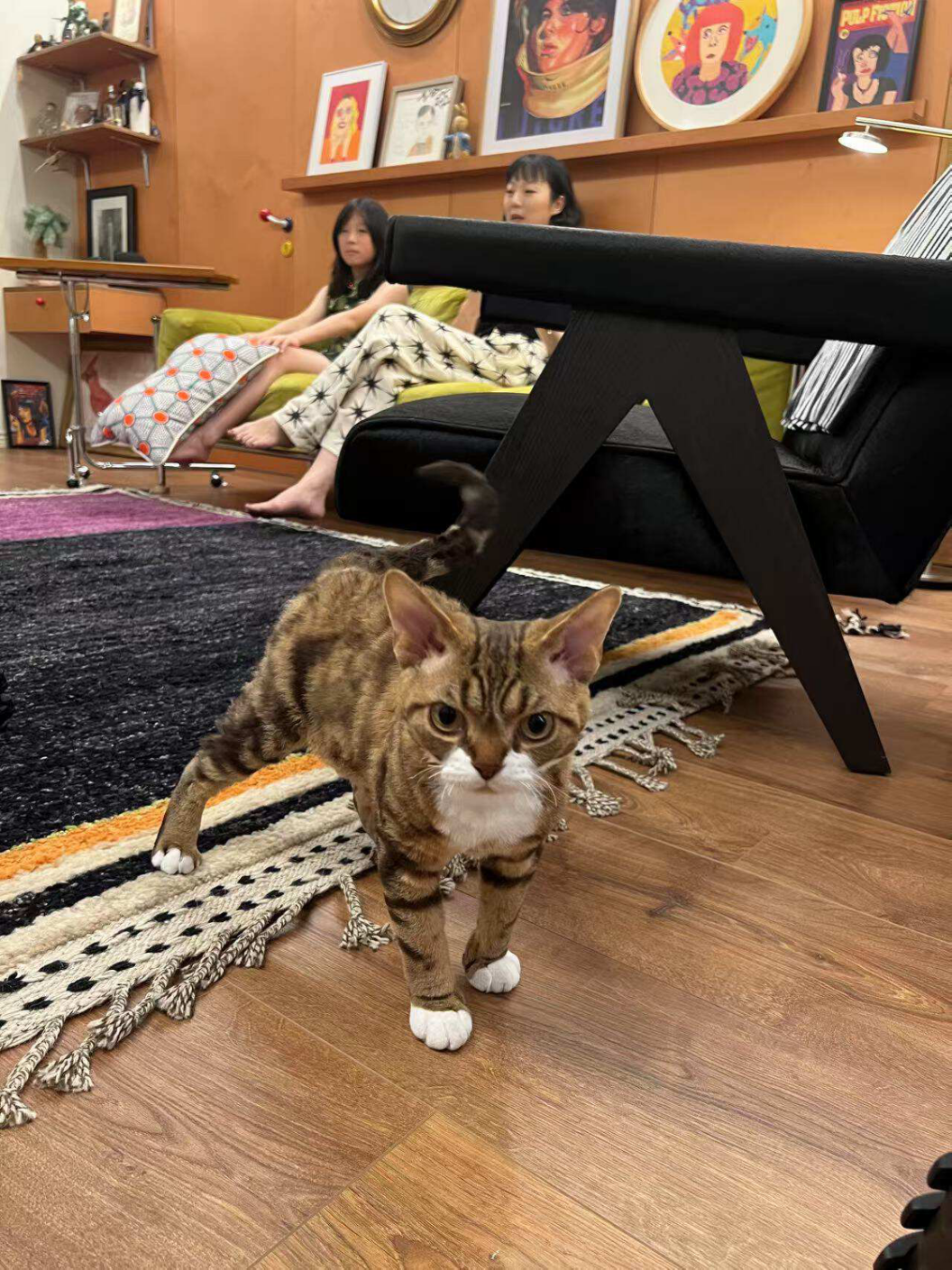 直到Doris坐到身边,采访的话筒无形中就交给了妈妈,Dora的“形态”一下就发生了转换——她从沙发滑到地毯上,模仿两只猫咪在做猫式伸展、下犬式、“装死式”等各种瑜伽动作……在一群大人面前,Dora自顾自地发呆,没人打断她。