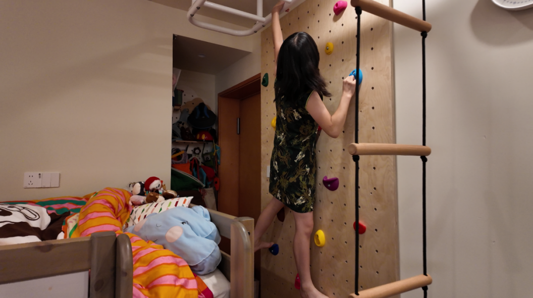 那是一个被想象力填满的空间:一面从地到顶的攀岩墙、一组秋千和单杠、一台偶尔用来扳手腕的桌子,桌上堆满五子棋、益智积木、卡皮巴拉玩偶,还有她自制的拼贴漫画。